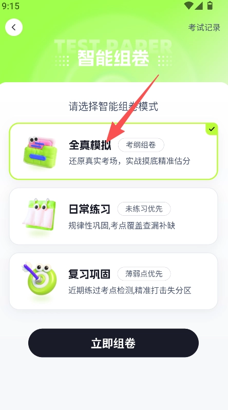 1、搭建多元智能组卷模式,涵盖全真模拟、日常练习、复习巩固等不同类型,每种模式分别匹配特定备考场景,可满足多样化的练习需求。