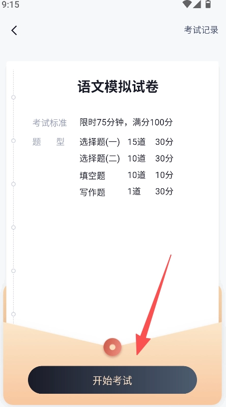 2、具备模拟考试功能,进入试卷页面查看考试相关信息后,点击开始考试按钮即可进行限时练习。