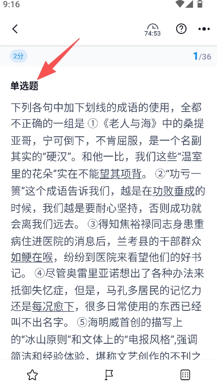 3、拥有题目练习的功能,进入考试页面后,可进行单选题等各类题型的作答操作。