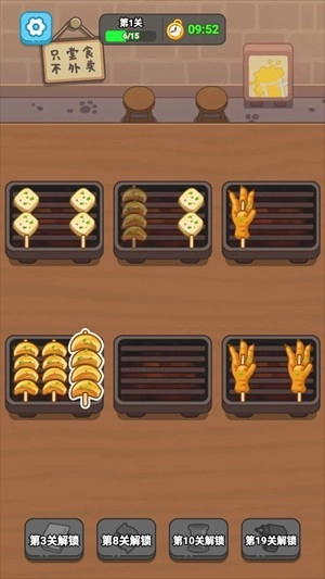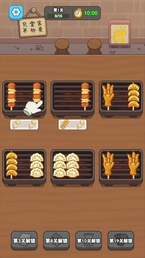 2、玩家只需把三个一样的串串摆到同一个烤肉盘里,就能完成消除操作