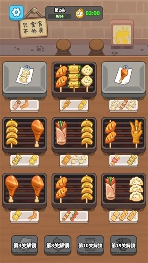 3、各种口味的烧烤等待玩家解锁,注意火候,玩法十分的优秀