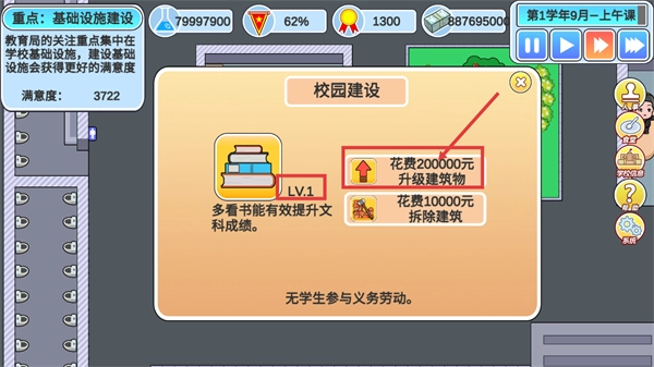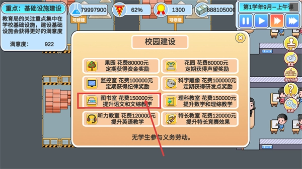 3、在校园建设时选择【图书室】,投入【150000元】能够增强语文与文综的教学成效,帮助学生提高对应科目的成绩。
