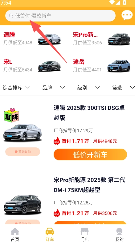 2、含综合排序品牌级别筛选功能,筛选可按指导价首付区间选择,细化车型选择条件。