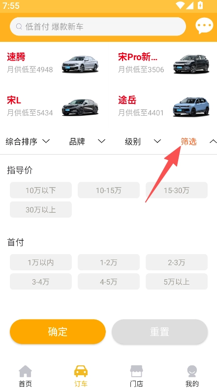 2、点击筛选选择指导价首付区间等条件,确定后查看筛选后的车型。