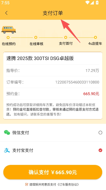 3、选择目标车型进入支付订单页面,选支付方式点击确认支付。