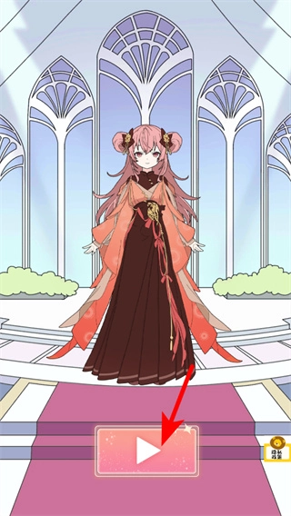 1、进入游戏界面后,点击红色箭头指向的播放按钮,开启角色装扮的游戏流程,这是进入装扮玩法的关键操作。