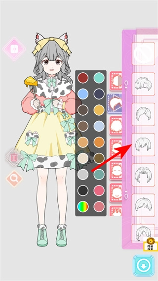 3、在装扮选项中,点击红色箭头指向的颜色选择器,挑选心仪的颜色样式,应用到角色的发型等部位,调整外观细节。