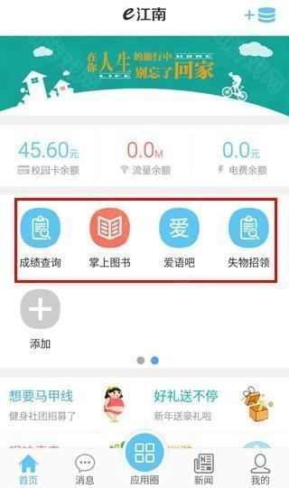 首页设有成绩查询、掌上图书、爱语吧、失物招领等功能入口,同时支持校园卡余额查询。
