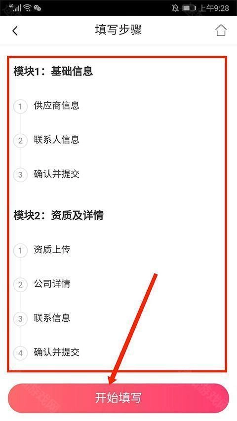 4、阅读完填写步骤后,选择下方“开始填写”即可开始入驻加盟。