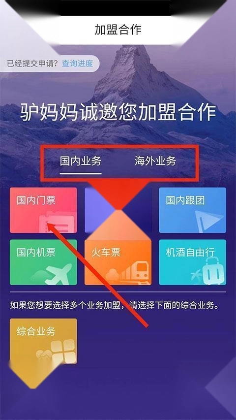 3、进入到加盟合作界面,包括“国内业务”和“海外业务”两大类型,选择需要加盟的业务,这里以“国内门票”为例,