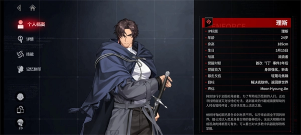 背景:持剑独行的异能者,擅长对抗人类及异界生物的战斗,持有黑色长剑,目标是消灭克锐特并返回原世界。