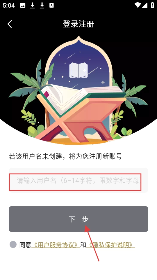 在登录注册页面,填写用户名,勾选同意相关协议,点击【下一步】,即可完成注册或登录操作。