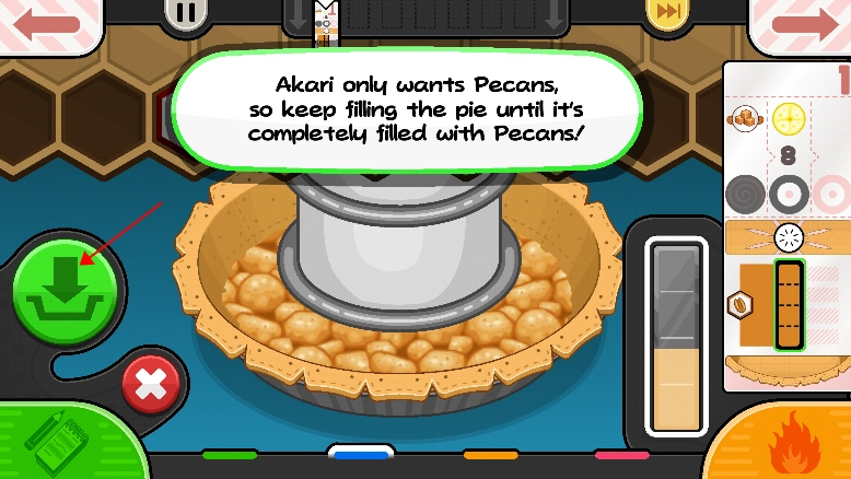 8、拖动上方的格子左右移动即可挑选水果,把想要的水果对准木盆的中间位置。