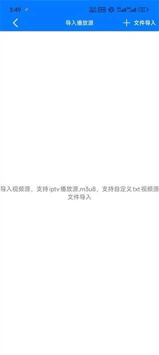 导入视频源,支持iptv播放源、m3u8格式,还可导入自定义的txt视频源文件