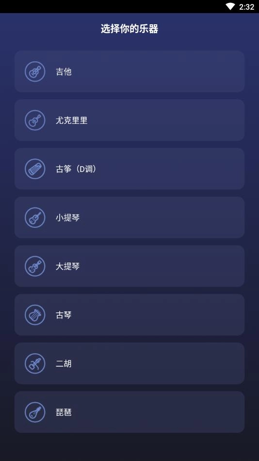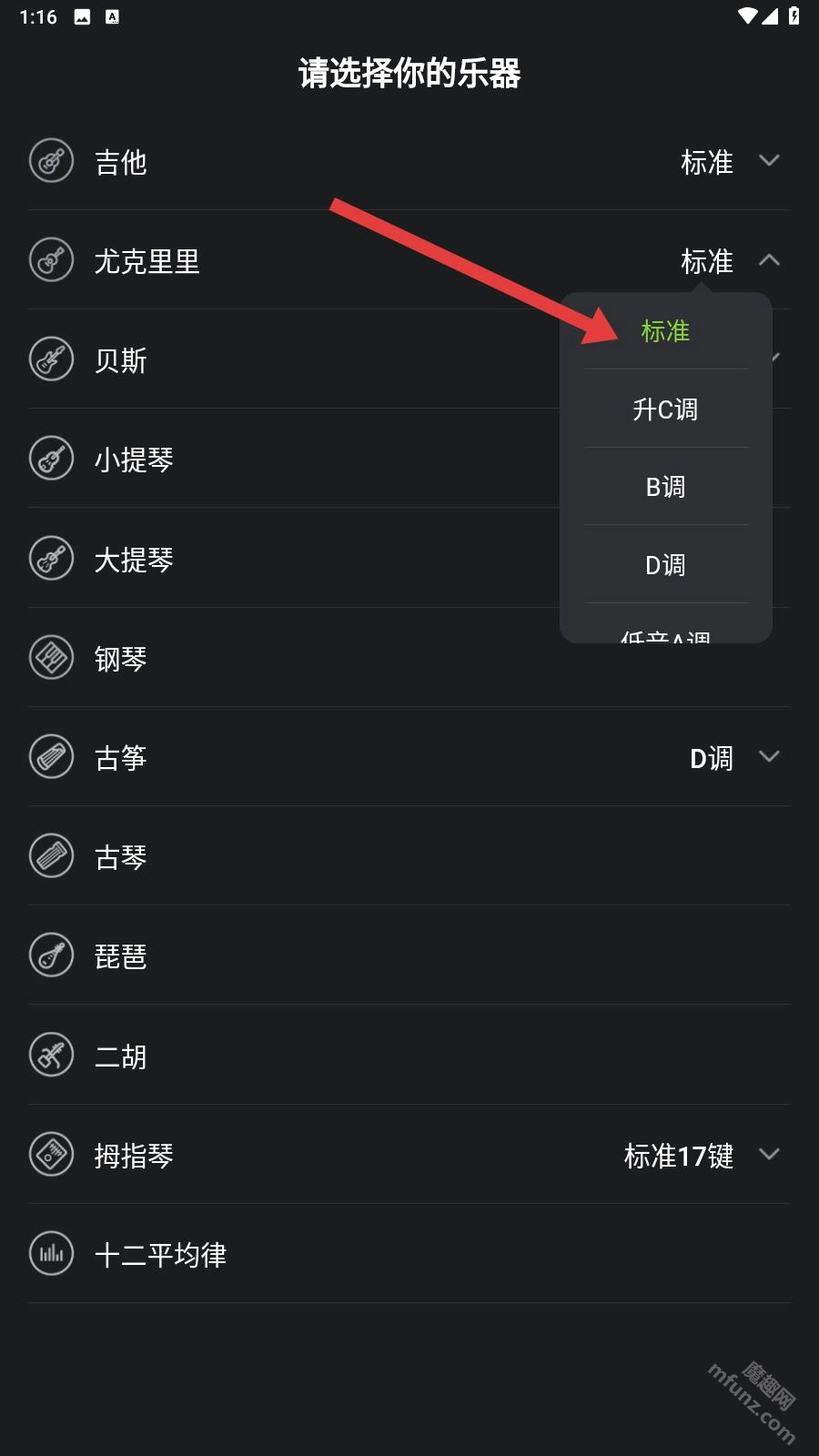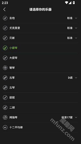 打开音调音器后选择乐器,若需更换,可在调音界面左上角重新选择。