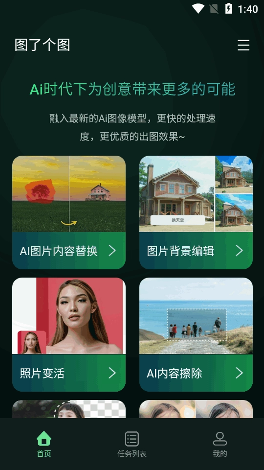 图了个图是一款融合前沿AI数字化技术的全新高科技图片创作与处理工具,不仅能为用户提供图片快速生成制作服务,还具备切换背景等多种实用功能,且操作简单易上手,即便是零基础的新手也能轻松掌握!