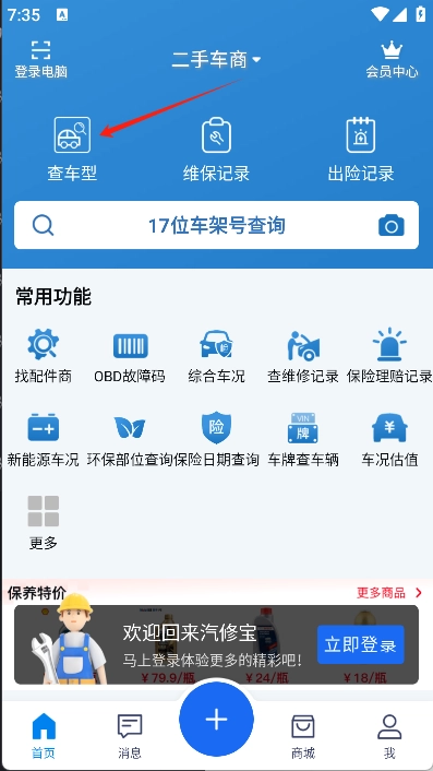 1、在首页中点击“查车型”选项。