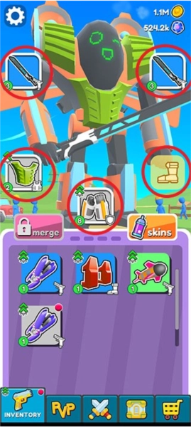 玩家可以点击屏幕左下角的手枪图案进入到升级装备界面,之后点击围绕在机器人周围的五个图案即可进行升级或者购买。