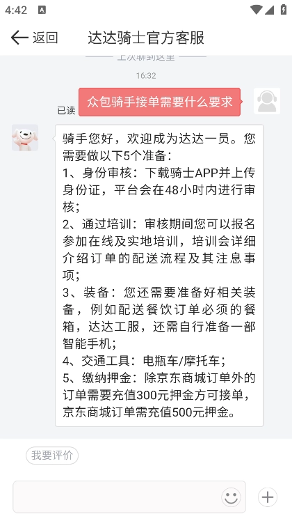 交通工具:电瓶车/摩托车;5、缴纳押金:除京东商城订单外的其他订单需充值300元押金才能接单,京东商城订单则需充值500元押金。