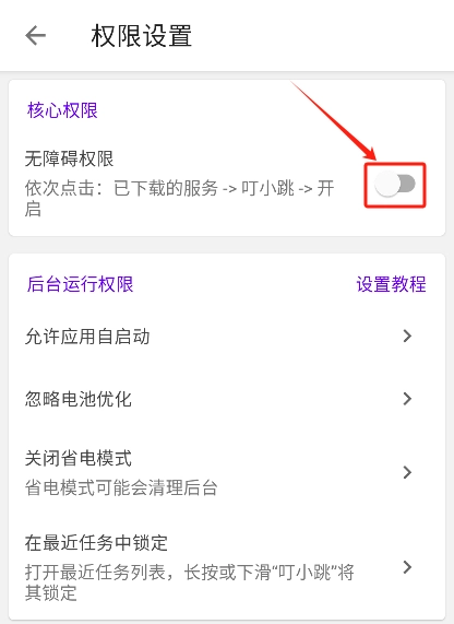 找到并点击“权限设置”选项,页面跳转后,点击开启核心权限中的“无障碍权限”,按照系统提示操作直至成功打开该权限。