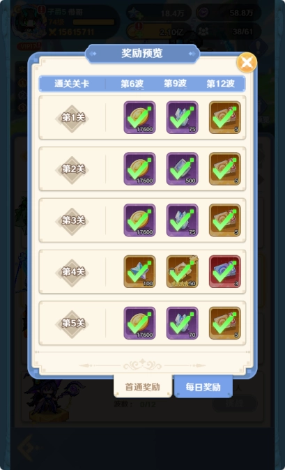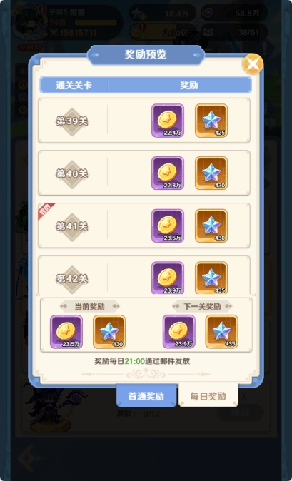 奖励分为首次通关奖励和每日奖励两种类型。每日奖励方面,玩家每天可依据当前通关的层数,领取相应数量的金币与星钻;首次通关奖励则设置在每一大关的第6、9、12小关,玩家通过这些关卡时能各领取一次首通奖励,奖励包含金币、装备强化石、抽卡券、星钻、随机五星英雄、阵营招募券以及升阶棱晶。