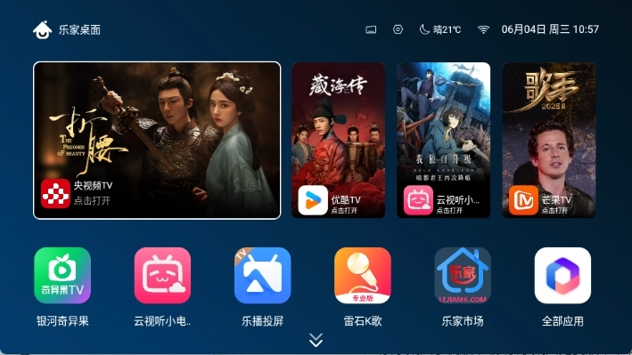 乐家桌面TV版是一款专门为智能电视与智能盒子打造的桌面管理工具,它整合了应用管理、文件管理、系统设置、个性化主题等多项功能,能够实现应用快速启动、主题一键切换、智能分类管理等便捷操作。此外,该软件还拥有出色的兼容性,可适配市面上多个品牌的智能电视和智能盒子。