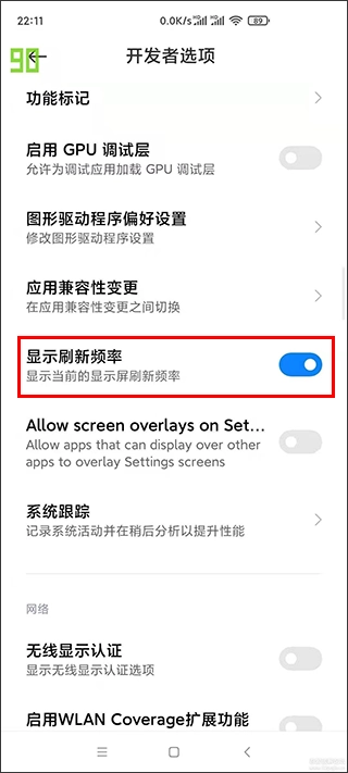 查看显示刷新频率的方法:进入开发者选项后,向下滚动找到“显示刷新频率”这一选项,确认它处于开启状态即可。