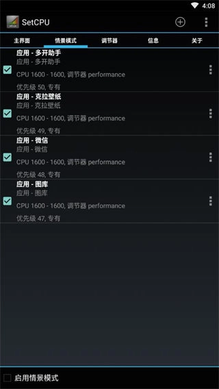 包含丰富的情景模式设置,用户可以根据设备和系统的条件来配置相应的CPU频率调节器,从而达到优化性能和省电的目的。