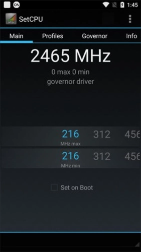 Set on Boot复选框能让SetCPU在设备首次启动时就应用Main选项卡的设置,这样您就不用每次重启后都特意去SetCPU里重新设置了。要是配置文件已经开启,“启动设置”复选框还会同时启动配置文件服务。