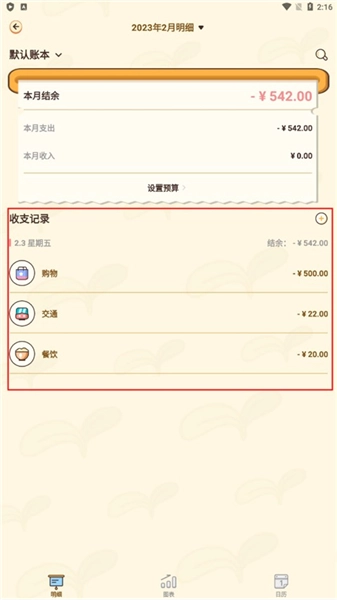 3、日历视图,每月收支一目了然。