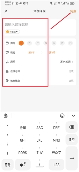 4.最后,把课程名称、上课星期几、课时、授课老师、教室位置等信息补充完整,点击“完成”按钮就可以了。