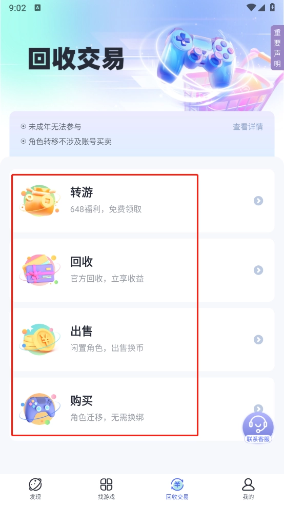 在“回收交易”板块中,涵盖了转游、回收、出售与购买等功能,您可依据自身需求进行选择。