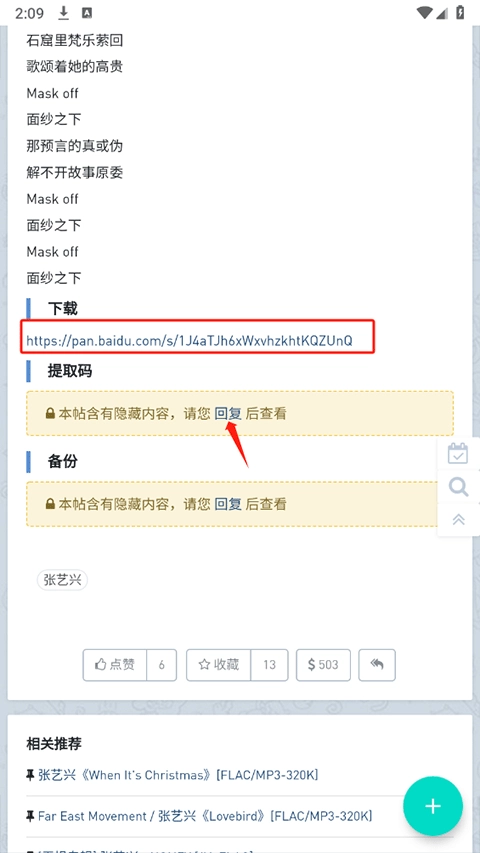 进入页面后,把页面向下滑动到最底部,就能看到歌曲的网盘链接。提取码是隐藏状态,得在评论区回复内容才会显示出来,所以请点击回复按钮。