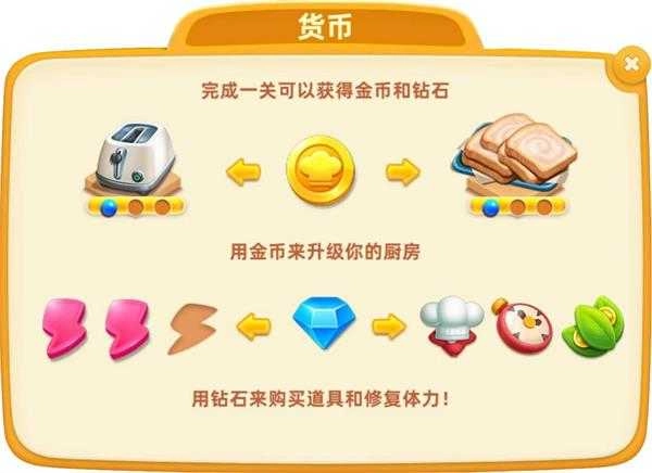 金币:完成关卡可以获得本关产出的金币(双倍加成道具、连击均可以提高金币的产出);金币用于升级设备和食材。