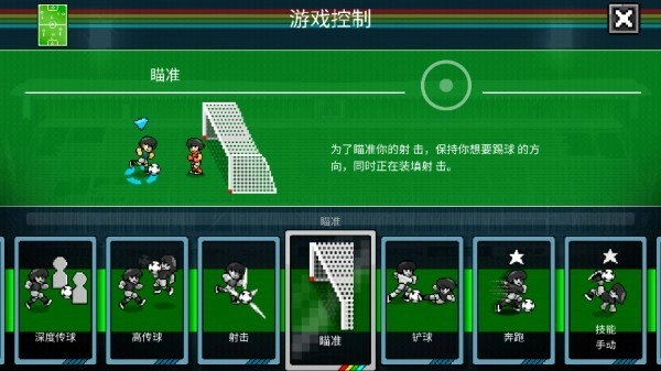 射击——按住射击按钮进行踢球,你按住按钮的时间将决定射击的类型、力量、精度;