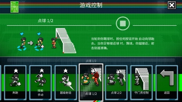 点球1——轮到你主罚时,按任意按钮就能自动朝球跑去,等距离球足够近时再踢球,离得越近射门越精准。