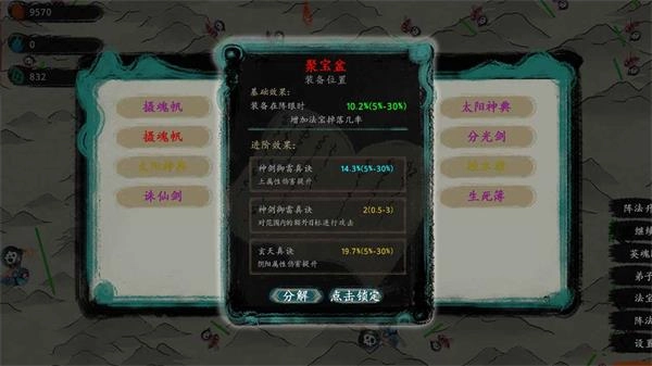 法宝可分为弟子法宝与阵眼法宝两种类型。阵眼法宝在前期的作用相对有限,原因在于其属性仅能发挥10%的效果,需要依靠轮回点来进行升级。接下来重点介绍弟子法宝,法宝本身的品阶并非关键,核心在于其附带的词条属性。比如:增加最终伤害、提升暴击率、扩展玄天真决的攻击距离、增加神剑御雷的攻击数量等。