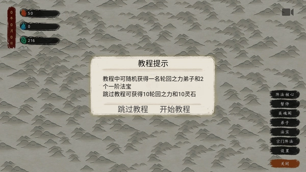 第一局通关后能继承一名弟子!建议用初始赠送的10轮回点进行单次抽取,抽到金色及以上品质且属性为阴或阳的弟子时,推荐保留下来。