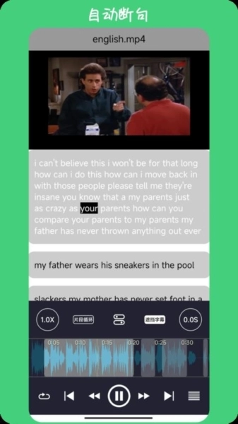 也可以点击开启音频转字幕功能,借助字幕来进行练习。