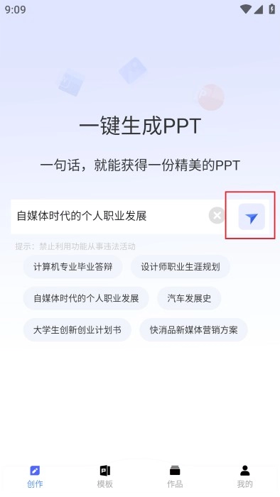 进入后就可以启动你的PPT生成流程了,你既能够自行编辑内容,也可以直接使用系统提供的模板,之后点击生成按钮即可。