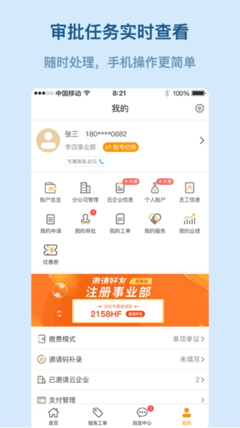 用户友好功能:用户能够便捷地查看员工信息、个人账户、云企业信息等内容。