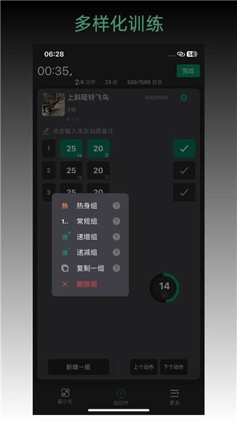 2、开启轻松记录功能,把每一组训练数据都记录下来,像重量、次数、组数这些都包含在内,让进步能清晰地呈现出来。