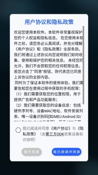 1、安装软件后进入,弹出用户协议和隐私政策,点击我已阅读并同意。