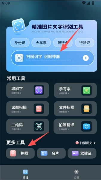 2、进入扫描界面后,这里提供了丰富多样的工具供你使用,随时都能进行扫图识字操作,其识别功能相当强大。