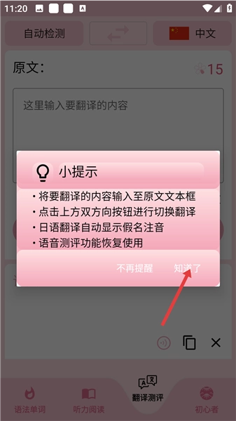 3、翻译功能界面设有操作指引小提示,涵盖输入翻译内容、切换翻译方向等步骤,日语翻译结果会自动附带假名注音,语音测评功能也已恢复正常使用。