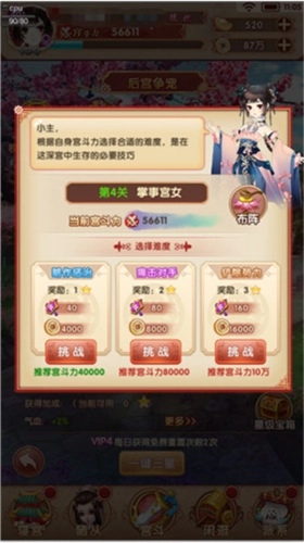 进入争宠玩法后,可在主界面查看到多个按钮。装备商店,奖励预览,星级宝箱均与此玩法的奖励相关,稍后再详细介绍。3关为一个大章节,点选界面上的人物形象即可进入战斗选择场景,建议玩家选择与自身战力匹配的挑战难度,不同的难度可获得的权势值,金币以及星级数都不同