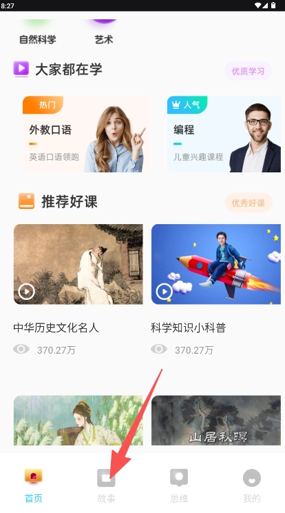 1、首页设有大家都在学热门推荐板块,集中展示外教口语、编程思维等高人气课程内容。