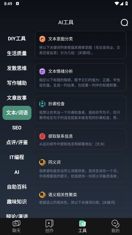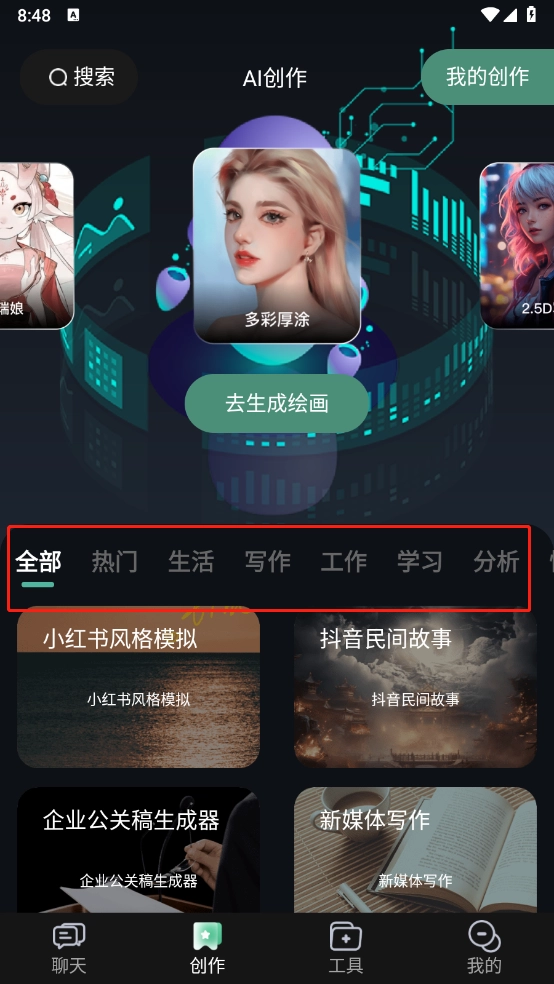 在“创作”板块,你能够开展各类文章与绘画的生成工作,助力攻克形形色色的创作难题。