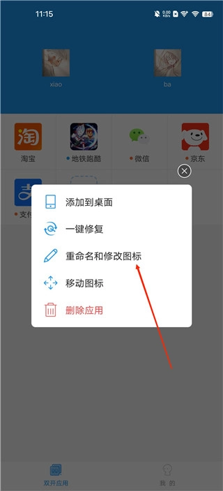 长按界面上的图标,会弹出功能菜单,可进行重命名、修改图标和调整位置等操作。