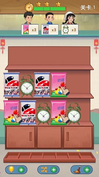 游戏运用三消与经营结合的玩法,玩家要消除相同物品来获得可上架的商品。